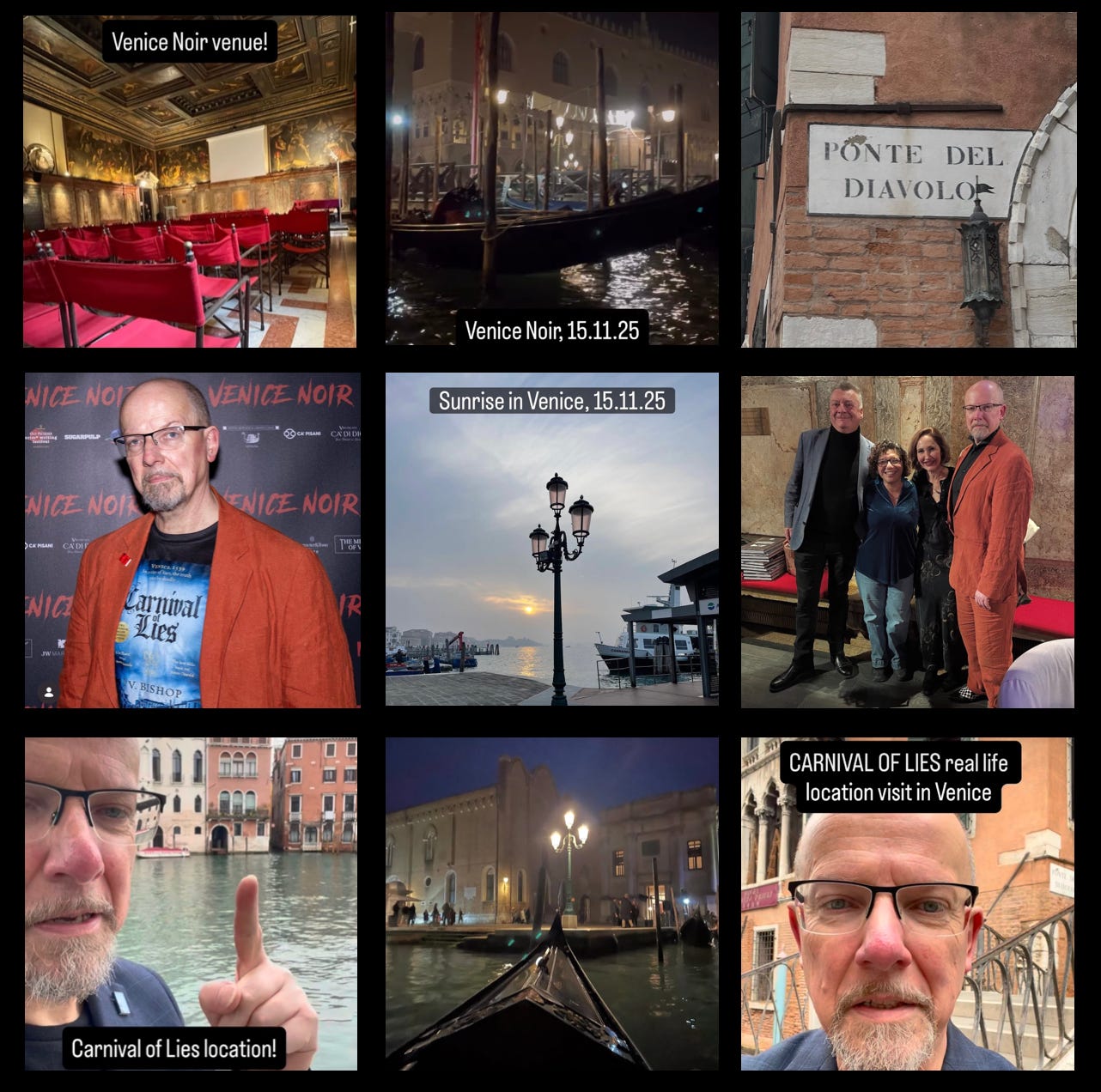 The amazing team at Serenity Booksellers in Romiley near Stockport hosted the launch for Carnival of Lies, the first time an Aldo novel has been launched in England. I participated in dozens of events to promote the book, but the highlight for me has to be Venice Noir in November 2025, taking the novel back to its source.