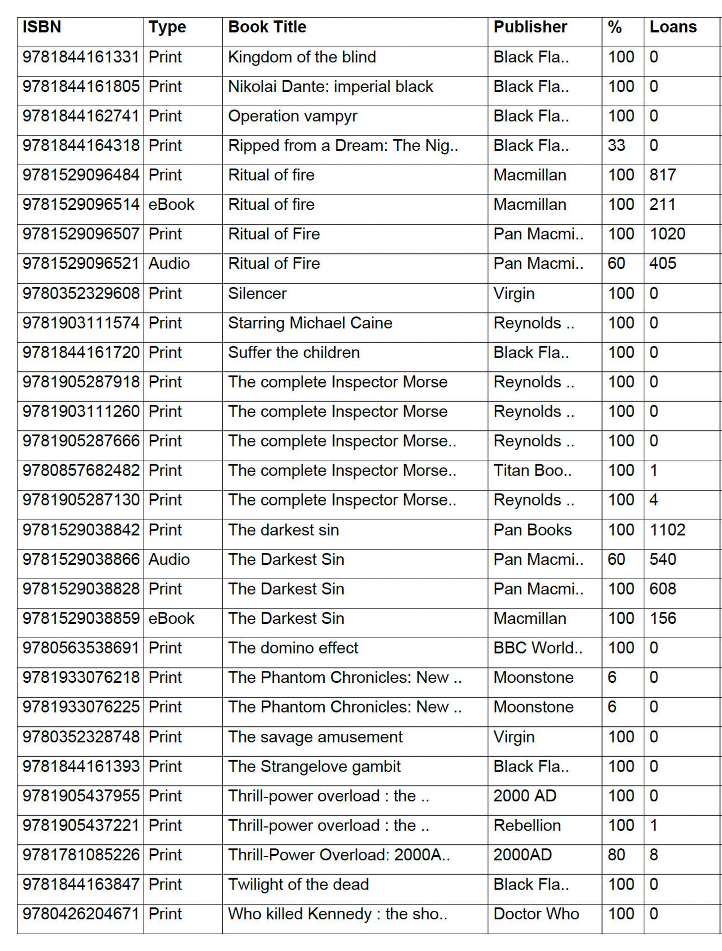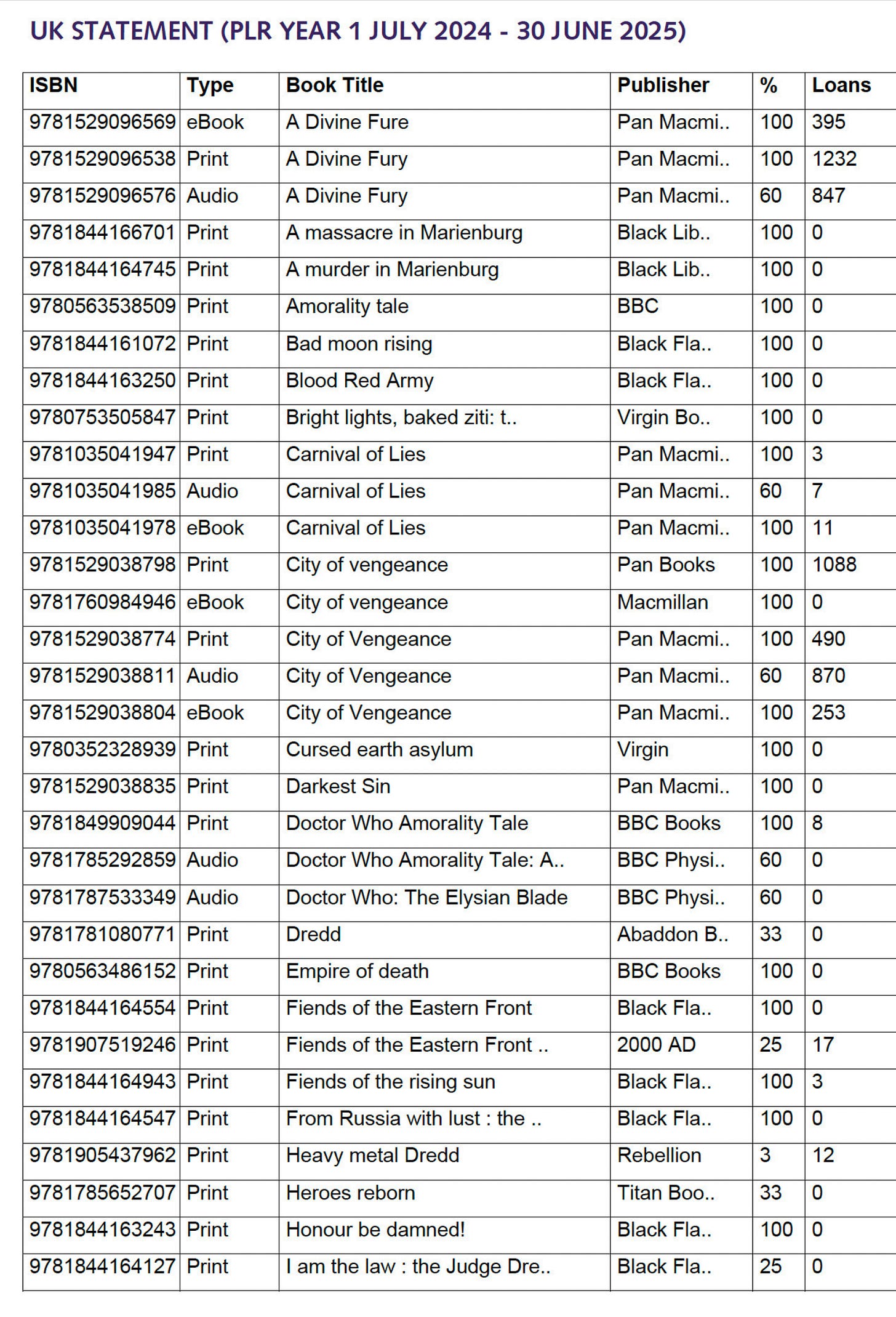 The first Aldo - City of Vengeance - was most popular, with A Divine Fury in second and Ritual of Fire a very close third. The Darkest Sin came in fourth, but by less than 50 borrowings. Carnival of Lies was only published in the last month covered by this statement so it hardly figured, but I expect it will do well in the 2025-2026 period.