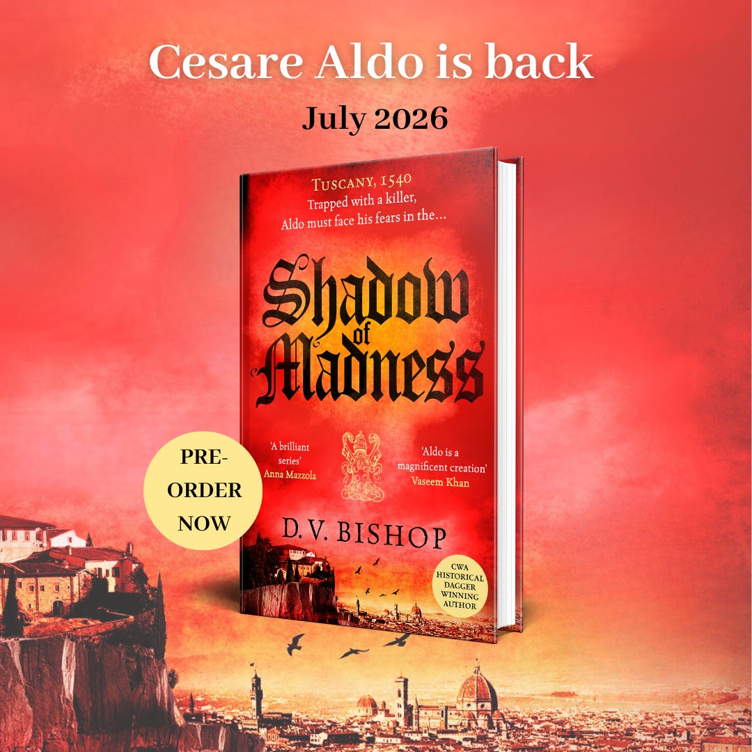 Last but not least, next week’s newsletter will be my 100th missive via Substack. Subscribers have grown from a dozen regular readers two years ago to hundreds of you now. By way of thanks, I’ll be running a competition for those based in the UK to win signed paperbacks of all five Cesare Aldo novels.