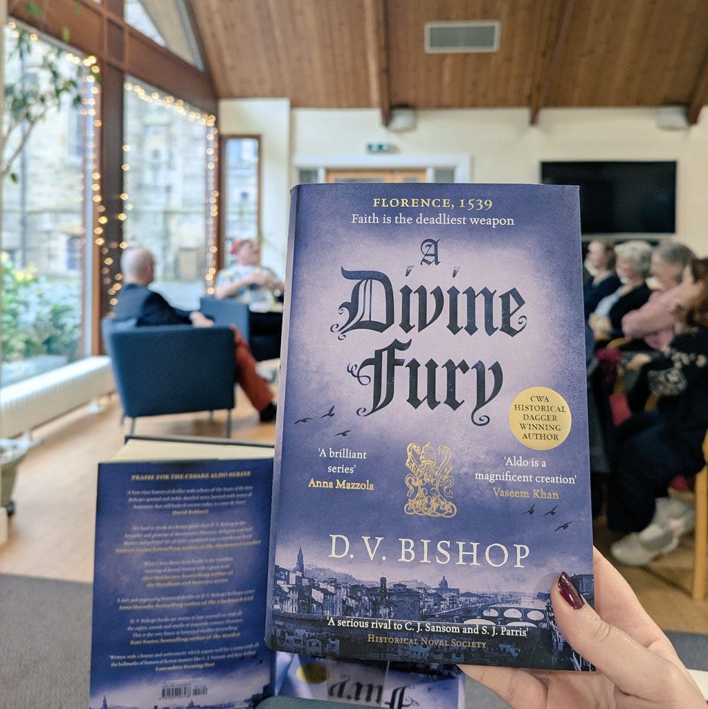 Welcome to the free newsletter of David (D. V.) Bishop, author of the Cesare Aldo historical thrillers set in Renaissance Italy. This time I’m looking back at what I did in 2024, including more than 40 promotional events.