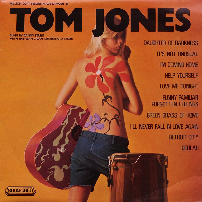 Another lively strand of this sound-alike sub-industry was releasing albums devoted to a particular artist, with front covers crafted to fool people into believing these were the originals. The subject’s name would be in huge type while the actual recording artist was mentioned but much smaller. Witness the Tom Jones sound-alike below…