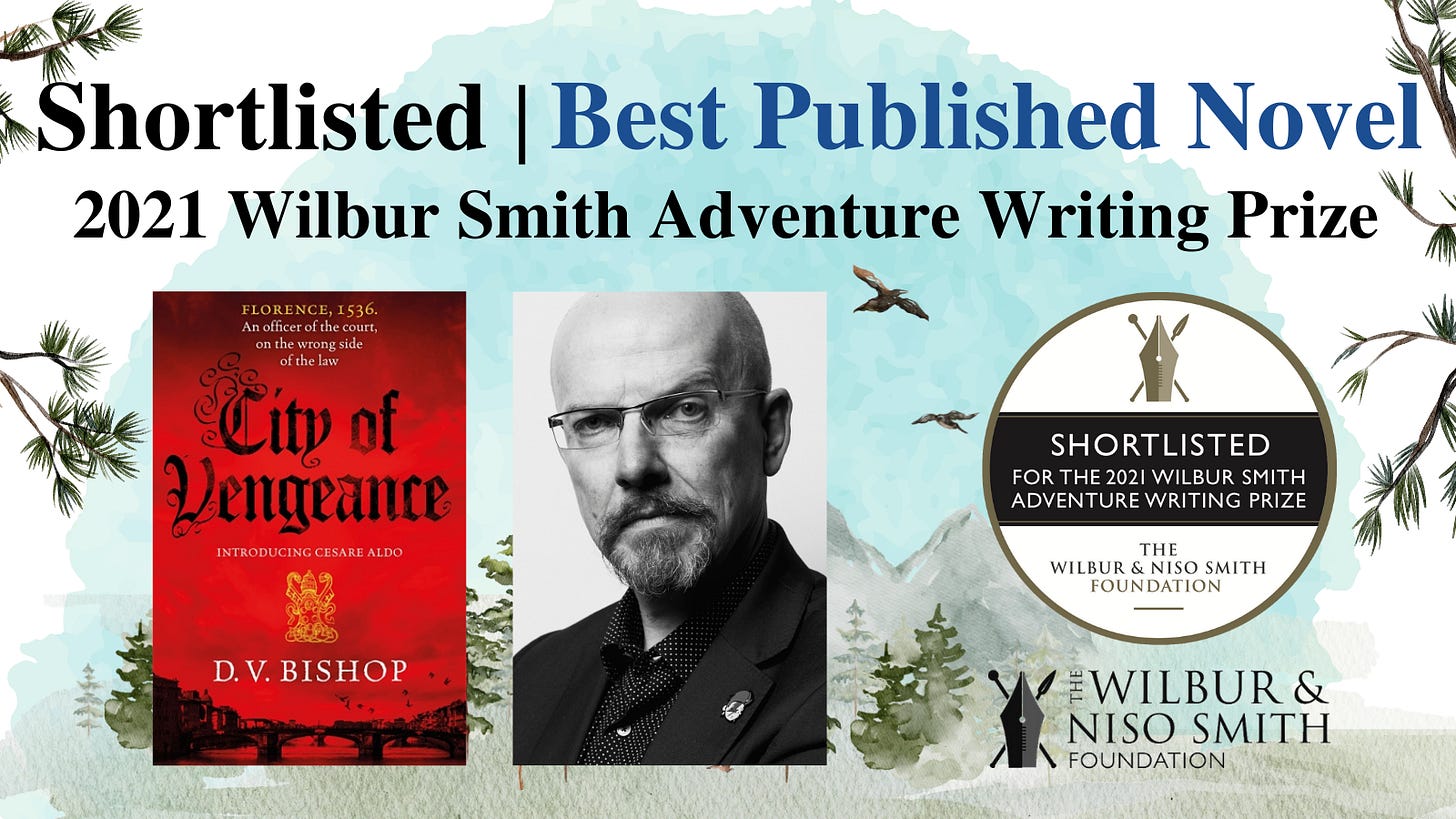 In May 2021 it was announced City of Vengeance had been longlisted for the Wilbur Smith Adventure Writing Prize. The novel made the six-strong shortlist as well, getting a healthy promo burst despite most events being stuck online. (Miss Benson’s Beetle by Rachel Joyce won the £10,000 prize.)