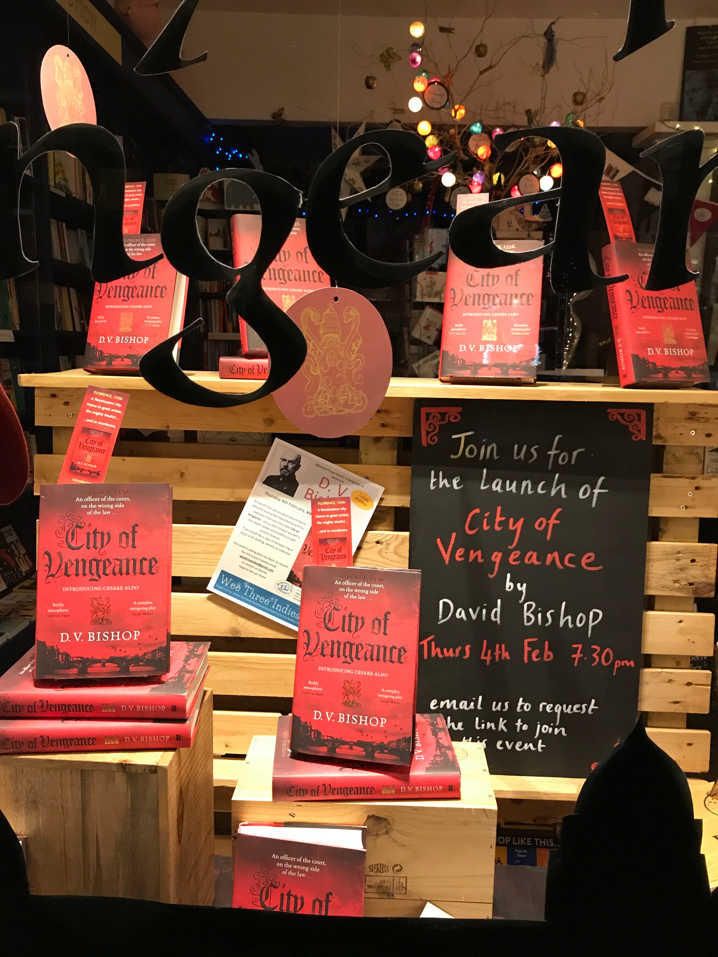 ABOVE: My local indie Atkinson-Pryce Books had this wonderful window display to advertise the online launch for City of Vengeance in the midst of a pandemic lockdown